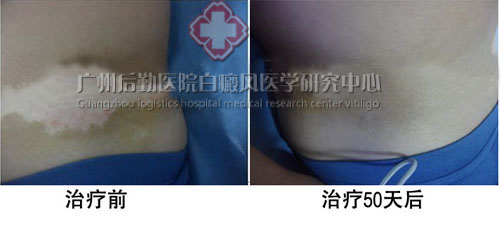 半年前,董某的生意日渐明朗,在妻子和朋友们的鼓励下,董某终于下决心解掉这“白色裤腰带“,在我院刘中海主任诊治下,建议董某先戒掉多年抽烟喝酒的习惯,根据董某的个人情况,刘主任为其制定了一套治疗方案。经过治疗50天之后,董某腰部的白斑面积变小,中间生成色素岛。看到腰部白斑好转的董某对自己的治疗很有信心,目前正在巩固治疗中。